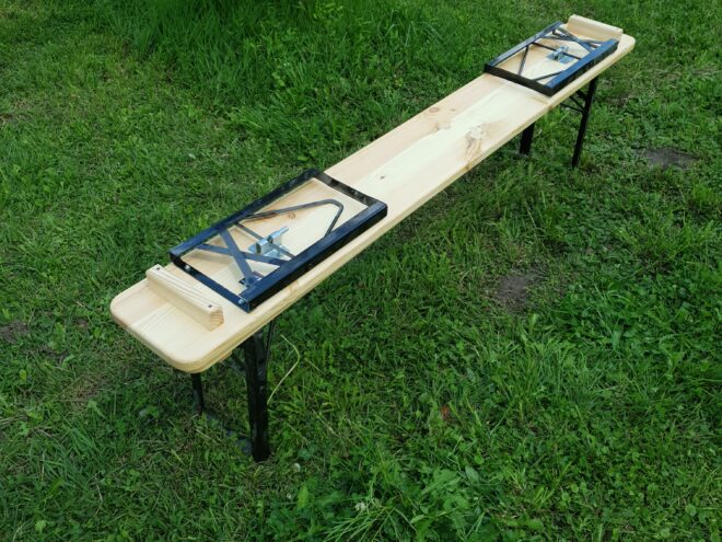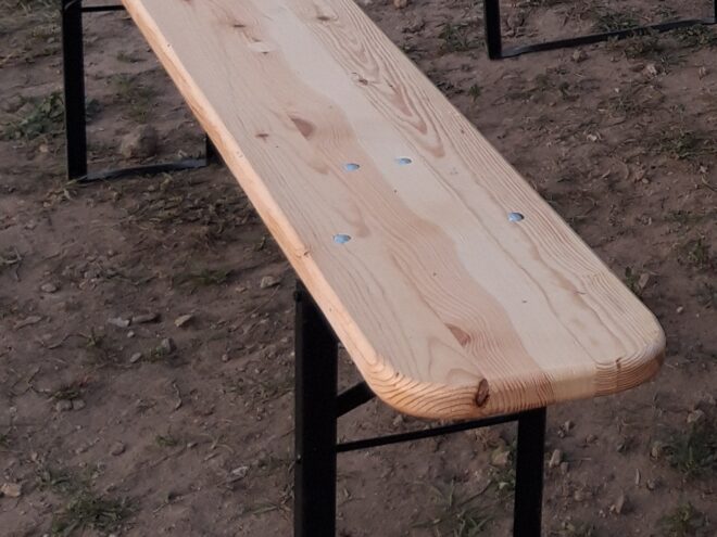 Лавки округлені. Верхня поверхня чисто полірується. Пофарбовані лаком. Фарби стійкі до тривалого сонячного світла і вологи. Ніжки металеві складні.