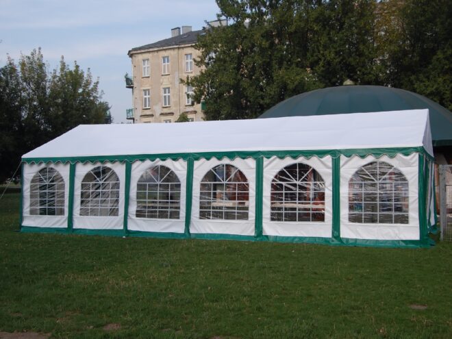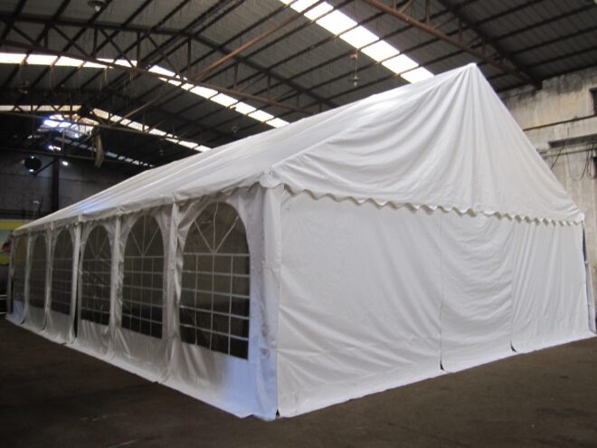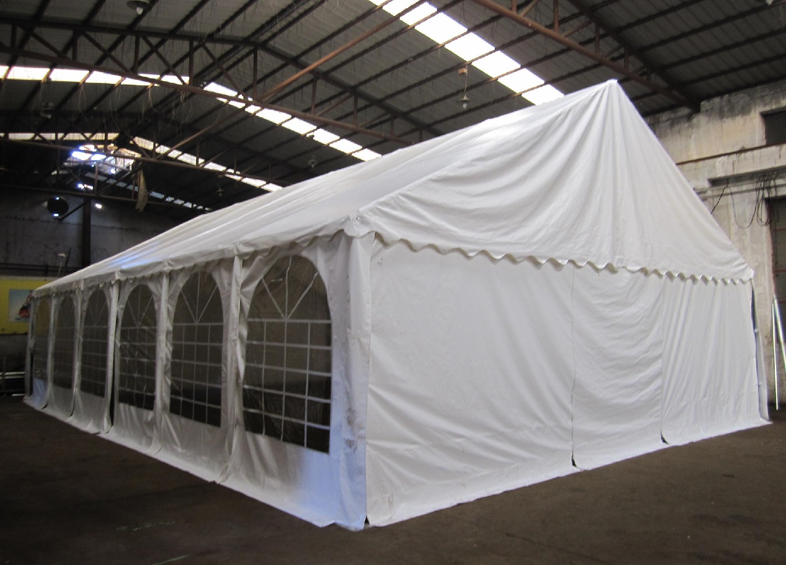 Дах намету складається з одного шматка ПВХ. Сталева конструкція даху забезпечує чудову стабільність і статику наметі. Бічні панелі складаються з 2-м в ширину елементів.