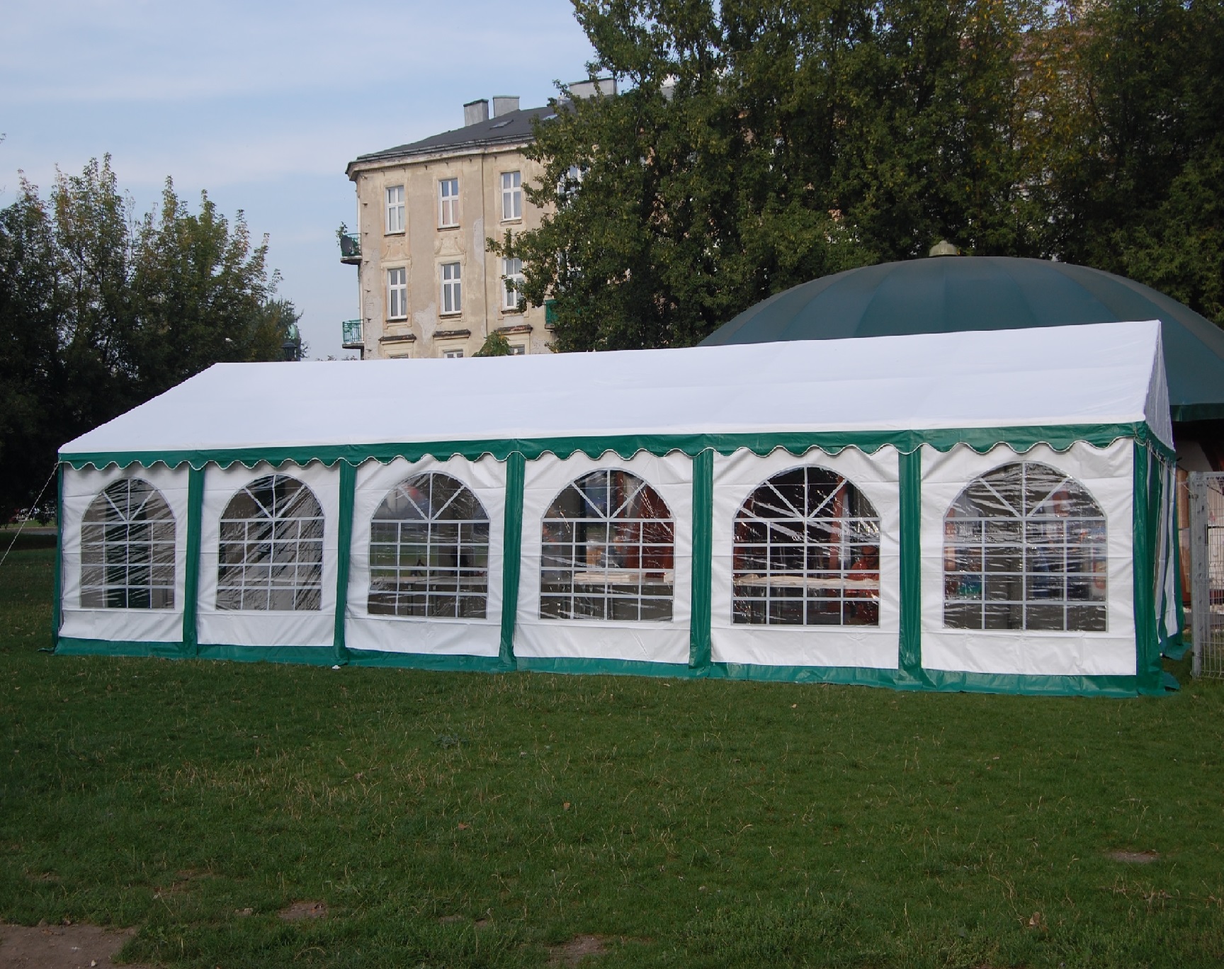 Дах шатра складається з одного шматка ПВХ. Сталева конструкція даху забезпечує чудову стабільність і статику намету. Бічні панелі складаються з 2-м в ширину елементів